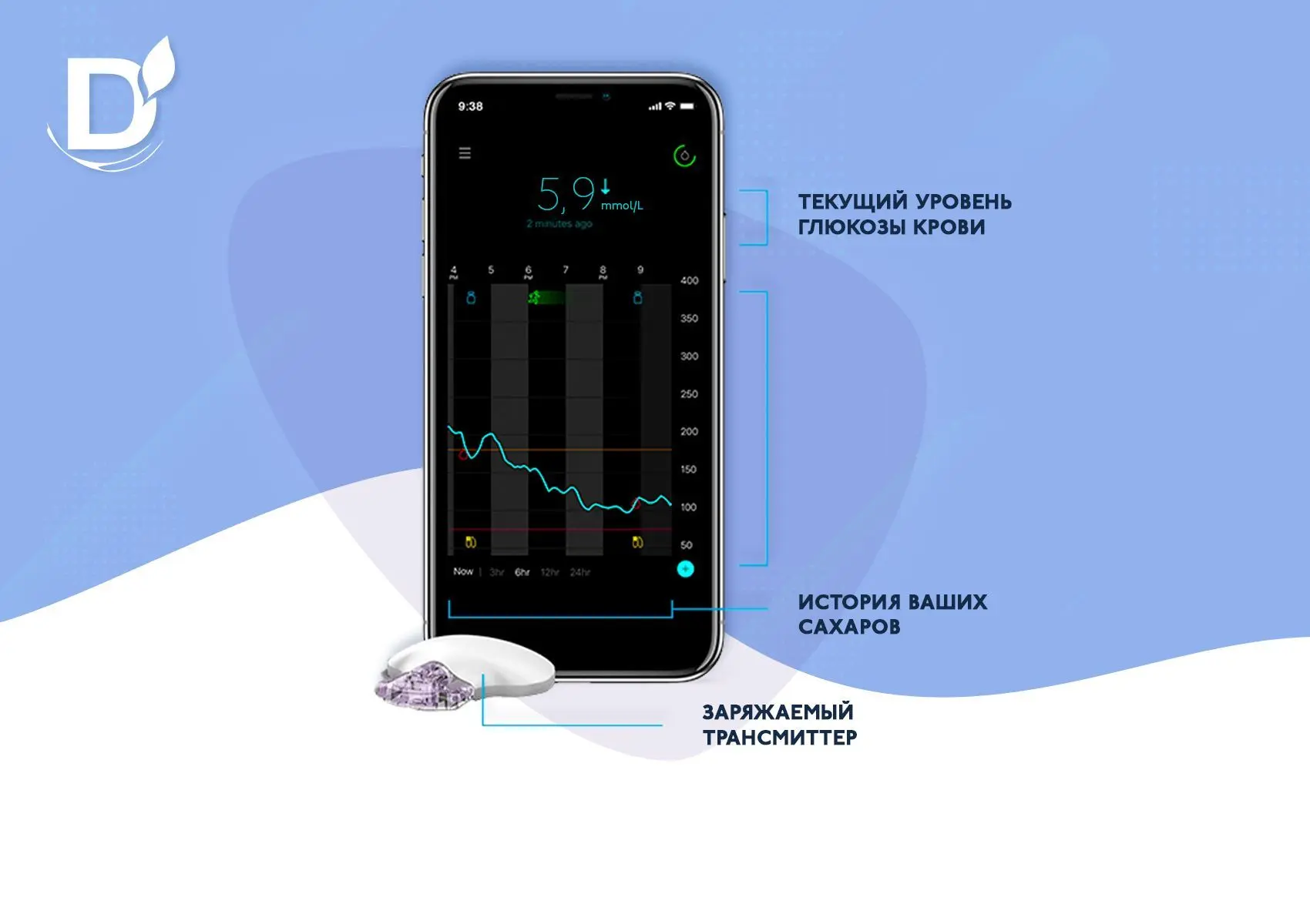 - Передатчик - небольшая насадка на сенсор, которая позволяет передавать информацию с сенсора на считывающий прибор (ридер, смартфон, часы и т.д.).