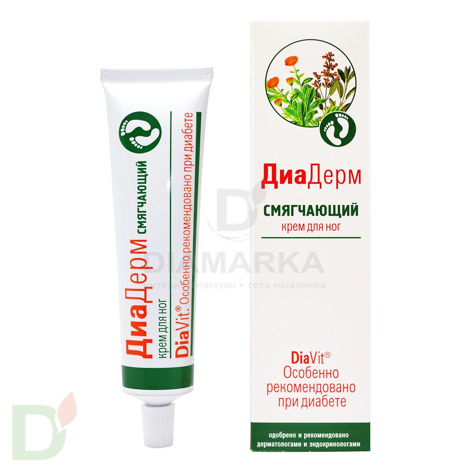 <h2>Ваша кожа под защитой DiaVit</h2> Продукция ДиаВит нацелена на устранение и профилактику свойственных для диабетиков проблем кожи и полости рта. Кремы ДиаДерм эффективны в борьбе с сухостью, воспалениями, шелушениями, трещинками и опрелостями. Они отлично питают, восстанавливают и увлажняют кожу. В то время как линейка ДиаДент не просто борется с бактериями, живущими в полости рта, но и укрепляет десны, устраняет их кровоточивость, уменьшает проявления ксеростомии и освежает дыхание.<br> <h2>Забудьте о сухости, трещинах и шелушениях</h2> Активные компоненты крема отлично справляются с увлажнением и питанием кожи, препятствуют ее излишнему ороговению, предотвращают появление сухих мозолей и натоптышей на стопах.<br> <h2>Состав крема ДиаДерм Смягчающий</h2> вода, изопропилпальмитат, пропиленгликоль, сорбитанизостеарат (и) гидрогенизированное касторовое масло (и) церезин(и)воск пчелиный, карбамид, масло минеральное, масло кокосовое, масло подсолнечное, глицерин, диметикон (и)циклометикон, октилизононаноат, витамин F, триизононаноин, сульфат магния, диполигидроксистеарат — ПЭГ-30, ПЭГ-7 –гидрогенат касторового масла, витамин Е-ацетат, масло авокадо, фарнезол(и) феноксиэтанол(и) монолаурат глицерина, камфора, фитоконцентраты мяты, календулы и семян клещевины, аллантоин, витамин А-пальмитат, масло шалфейное, ДМДМ – гидантоин,метилпарабен, пропилпарабен.