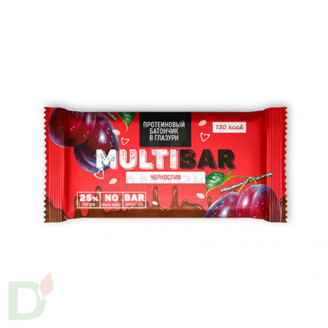 <h2>Высокопротеиновые батончики Мультибар без сахара</h2> Мультибар - продукты для правильного и здорового питания из натуральных ингредиентов. БЕЗ сахара, красителей и ГМО. За сладость в протеиновых батонах Мультибар отвечает изомальтоолигосахарид - природный посдластитель, который обладает сладким вкусом, при этом содержит в разы меньше калорий и углеводов, чем сахар.<br> <br> <h3>Преимущества протеиновых батончиков Мультибар</h3> <ul> <li>пониженное содержание углеводов и калорий</li> <li> не вредят зубам</li> <li> очень сытные и питательные, тк на 20% состоят из белка</li> <li> удобно брать с собой</li> </ul> Мультибар - нежный протеиновый батончик, покрытый шоколадной глазурью. Вкусно, сытно и по калориям приятно. Удобно брать с собой, куда бы вы не направлялись!<br> <br> Масса нетто 40 грамм<br> <h3>Состав батончика Мультибар с черносливом</h3> Кондитерская глазурь (подсластительизомальтоолигосахарид, заменитель какао-масла, какао-порошок, эмульгатор-лецитин соевый Е322, ароматизатор), кокосовое масло, чернослив, концентрат молочного белка сухой, концентрат сывороточных белков сухой (изолят), подсластитель изомальтоолигосахарид,ароматизатор пищевой, консервант (сорбат калия).При чрезмерном употреблении может оказывать слабительное действие. Для непосредственного употребления в пищу как продукт с высоким содержанием легкоусвояемых молочных белков и пищевых волокон.<br> <h4>Пищевая и энергетическая ценность на 1 батончик</h4> Белки 10<br> Жиры 5,3<br> Углеводы 14,3<br> Пищевые волокна 5<br> 145 кКал