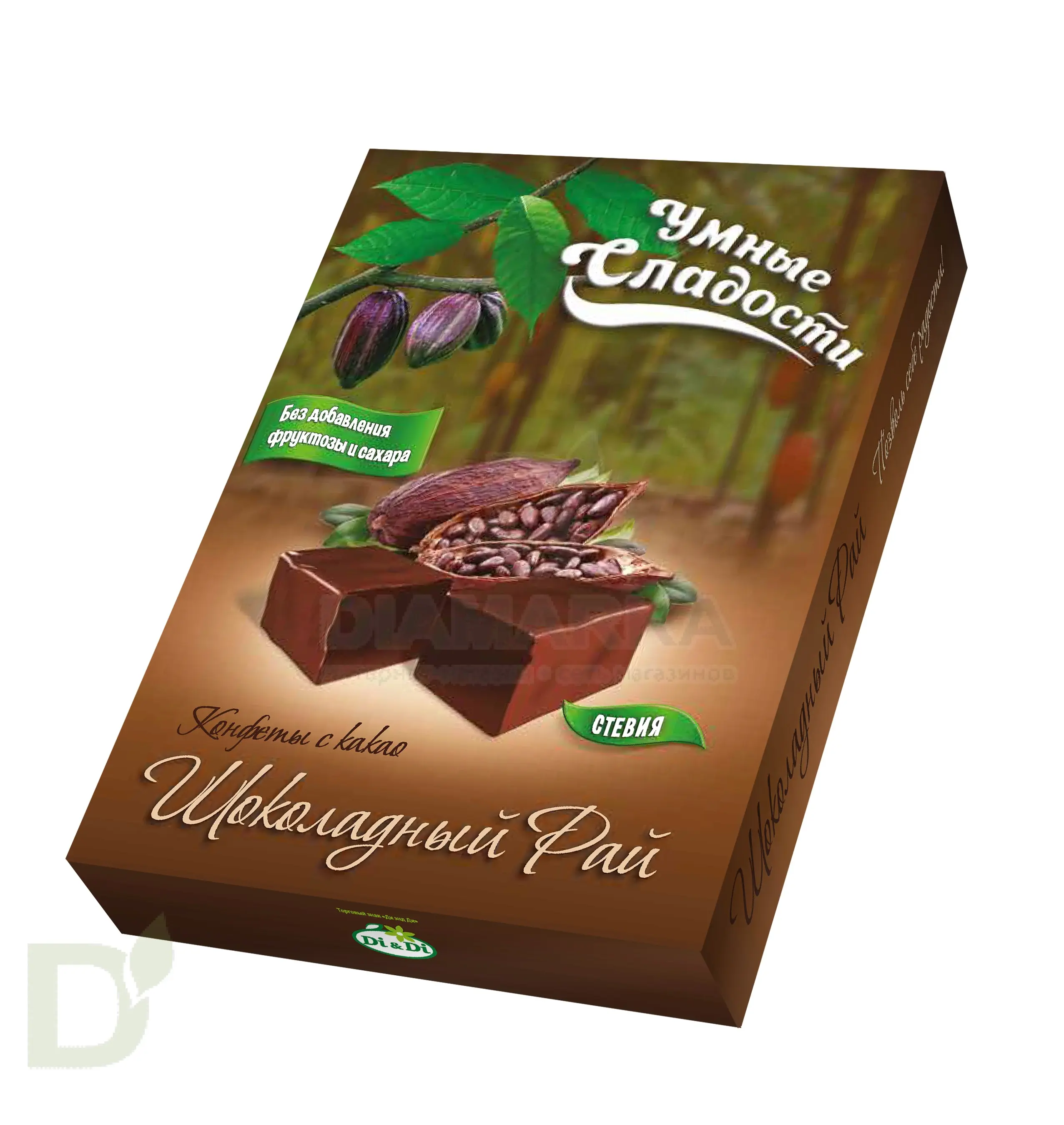 <h2>Правильные конфеты для правильных чаепитий</h2> Конфеты = сладость = много сахара. Такая установка сидит в голове у большинства людей. Хорошо, что мы живем в 21 веке и конфеты без сахара и его аналогов - вполне себе реальность, а не мечта!<br> <h2>Преимущества конфет без сахара</h2> <ul> <li>низкая скорость усвоения углеводов</li> <li> меньше калорий (в сравнении с обычными конфетами)</li> <li> не провоцируют развития кариеса</li> <li> ПРИ ЭТОМ по вкусу неотличимы от обычных конфет!</li> </ul> <h2>Что дает сладость</h2> Как было сказано выше, умные сладости не содержат сахара и его углеводных заменителей. Вместо них используются изомальт и стевия - природные низкокалорийные заменители, которые не оказывают на организм столь вредного воздействия, как сахар и аналоги.<br> <br> Масса: 90 грамм<br> <h2>Состав конфет Шоколадный рай</h2> патока, жир растительный нелауринового типа, подсластитель изомальт, мальтодекстрин, какао-порошок, сыворотка сухая молочная, молоко сухое цельное, эмульгатор лецитин Е 322, подсластитель стевиозид, ароматизаторы «тоффи», ванилин; глазурь молочная: заменитель какао- масла лауринового типа, подсластитель изомальт, сыворотка сухая молочная, мальтодекстрин, какао – порошок, молоко сухое обезжиренное и цельное, эмульгатор лецитин соевый, подсластитель стевиозид, ароматизатор «шоколад молочный».<br> <h2>КБЖУ на 100 грамм конфет</h2> <ul> <li>388 ккал</li> <li> б - 1,8</li> <li> ж - 14,6</li> <li> у - 67,7</li> </ul>