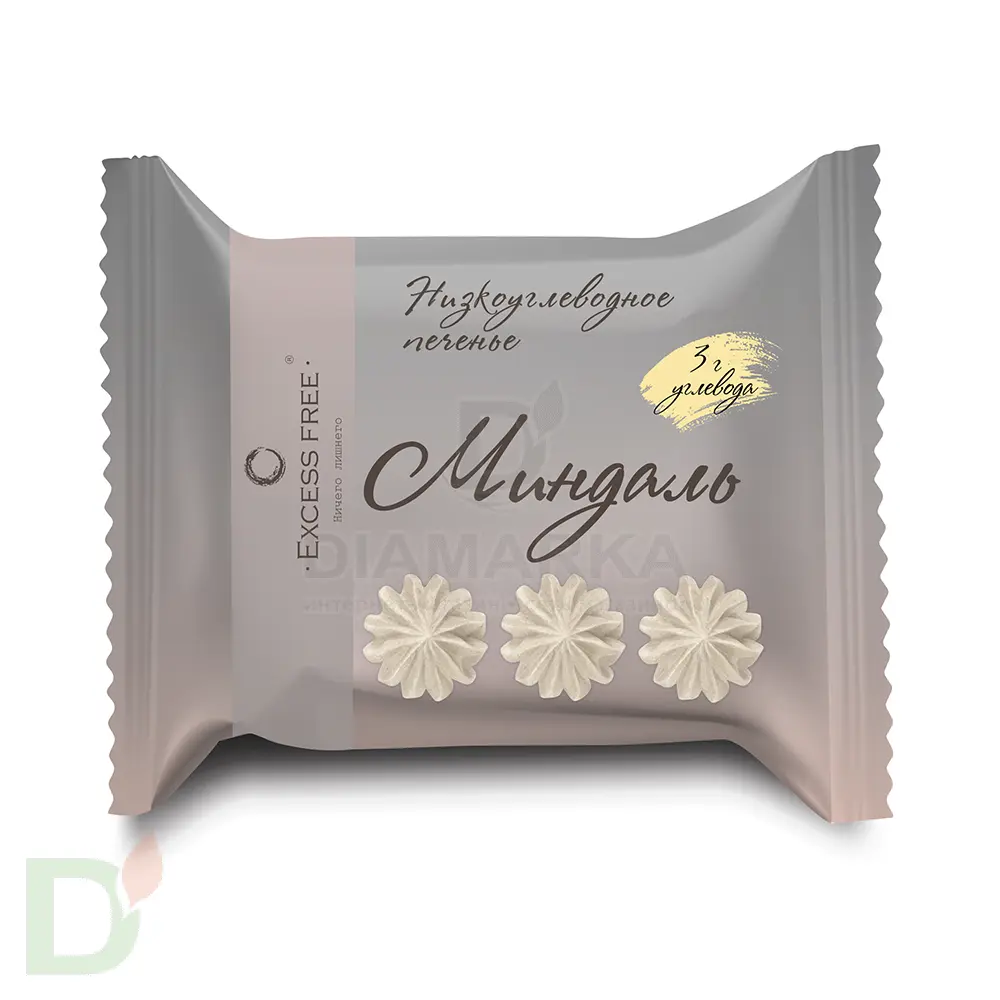 <h2>Низкокалорийное печенье без сахара, которое можно на диете</h2> Печенье с 3 граммами углеводов на 100 грамм? Это не сказка, это - низкоуглеводное печенье ExcessFree! А еще в нем нет муки и лишних жиров. Состав при этом натуральный и не содержит искусственных ингредиентов.<br> <br> Спасибо Excess Free за возможность хрустеть вкусными печенюшками без вреда для здоровья, фигуры и уровня сахара крови! Даже съеденное перед сном, это печенье не отложится сантиметрами на талии, ведь содержит ничтожно мало калорий и углеводов.<br> <br> <h3>Почему ДиаМарка рекомендует низкоуглеводное печенье ExcessFree?</h3> <ul> <li>в составе нет муки и сахара</li> <li>содержит ничтожно малое количество углеводов и калорий</li> <li>обогащено пищевыми волокнами</li> <li>не содержит усилителей вкуса, консервантов, искусственных ароматизаторов</li> <li>можно есть без подколки инсулина и даже перед сном</li> <li>расфасовано в индивидуальную упаковку, поэтому его очень удобно брать собой, куда бы вы не направлялись: на прогулку, в спортзал, на работу/учебу и тд.</li> </ul> <h3>Состав печенья Excess Free</h3> натуральный подсластители: изомальтоолигосахарид, эритрит; яйцо куриное, белок яичный , растительные пищевые волокна, пищевой ароматизатор, натуральный собрат калия, экстракт стевии.<br> <h4>Пищевая и энергетическая ценность на 100 грамм</h4> 42,6 ккал<br> белок - 6,3<br> жиры - 0,6<br> углеводы - 3<br> пищевые волокна - 26<br> <br> Масса нетто: 35 грамм<br> Срок годности 3 месяца